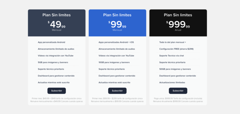 Escoge la Suscripción de acuerdo a tu necesidad. Las opciones de los planes son ilimitadas y el cambio entre ellas es de acuerdo a las aplicaciones escogidas iOS o Android o ambas.